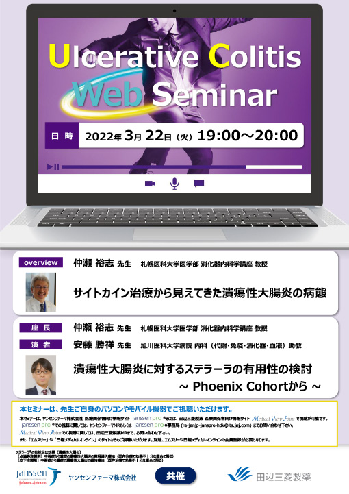 【開催延期】サイトカイン治療から見えてきた潰瘍性大腸炎の病態/潰瘍性大腸炎に対するステラーラの有用性の検討~Phoenix Cohortから~